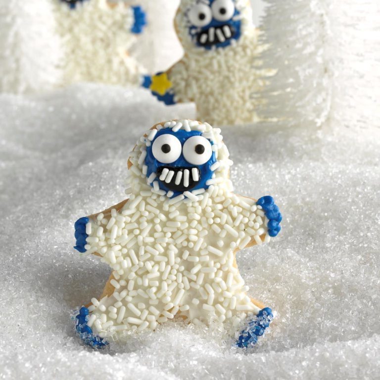 Étaler les biscuits avec le glaçage à la vanille et décorer avec des saupoudres. Ajouter le visage, les mains et les pieds avec du glaçage bleu; ajouter de la bouche avec du glaçage noir.Utilisez des éclaboussures supplémentaires pour les dents; Ajoutez des yeux.Si vous le souhaitez, ajoutez des pépites ou des bonbons supplémentaires pour la décoration.