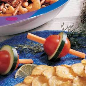 Une simple combinaison de légumes frais constitue une garniture irrésistible de type "canne à sucre", en particulier lorsque vous placez un lit d'herbes "algues". Vous pouvez également utiliser du céleri à la place des carottes, des radis plutôt que des tomates et des courgettes ou des courges jaunes au lieu du concombre. Laissez votre imagination et la générosité de votre jardin devenir votre guide.