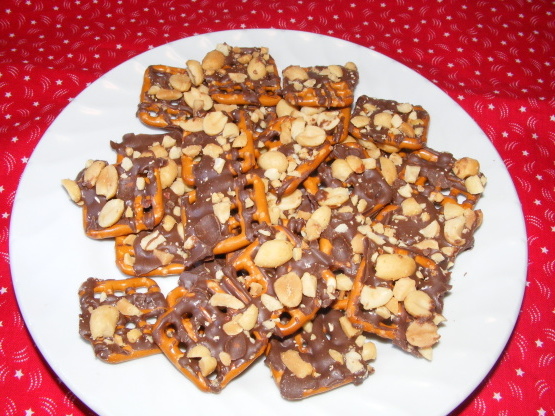 Facile et amusant à faire! Le goût des bretzels et du chocolat vont bien ensemble. Ceux-ci sont fabriqués avec les minuscules carrés de bretzels du nom de Snaps sur le sac.Utilisez n'importe quelle noix hachée, mais le goût des cacahuètes avec le chocolat est le meilleur.