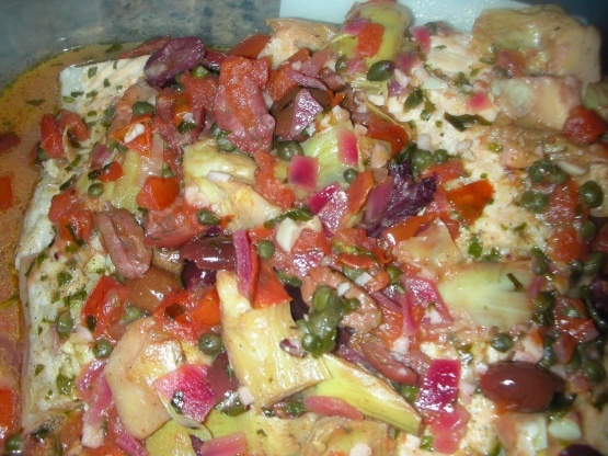 Dans une sauteuse, combiner les olives calamata, le vin, le mélange de pinceaux, les cœurs d'artichauts, l'ail de 113 grammes (moins si vous le souhaitez), les câpres et le jus de citron (2-3 T si vous n'avez pas de frais) .Chauffer à ébullition .