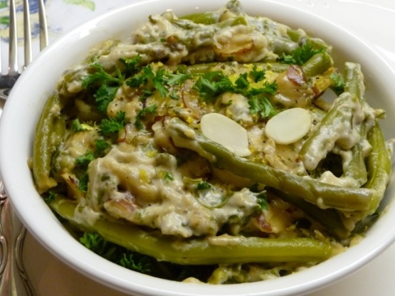 - 1 sac (510 grammes) congelé de minuscules haricots verts entiers avec des amandes tranchées, décongelés (les marques C et W Bird's Eye le proposent, ou utilisez des haricots verts surgelés plus une tasse de 80 ml contenant des amandes effilées)