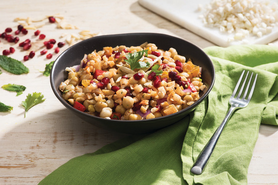 Mélanger ensemble Cauliettes refroidies, pois chiches, poivron rouge, oignon rouge, jus d'orange, abricots, amandes et 2 c.