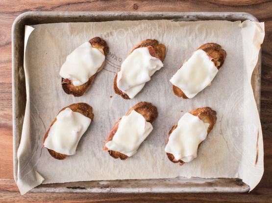Assemble crostini, with ham first then cheese.Cook under broiler until until cheese is melted and ham is warm.Watch carefully!