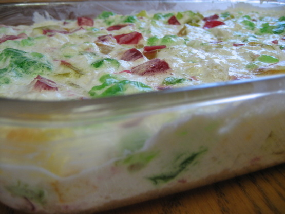 Lorsque les gélatines aromatisées sont fermes, couper en cubes de un centimètre; incorporer délicatement au mélange de garniture fouettée.