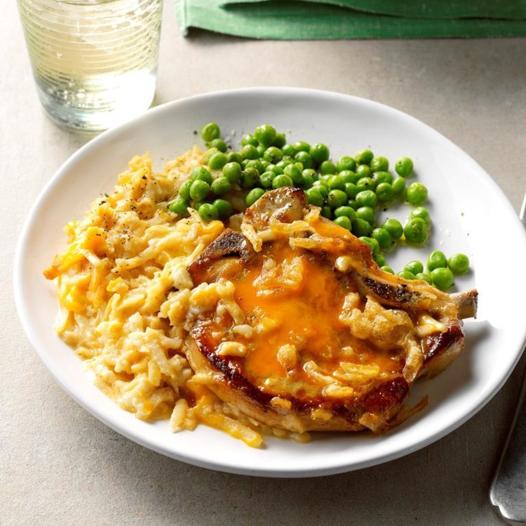 Des côtelettes tendres cuisent sur un lit de pommes de terre crémeuses dans ce repas complet. C'est un jeu d'enfant à assembler grâce aux pommes de terre rissolées congelées, à la soupe en conserve, au fromage râpé et aux oignons frits. — Dawn Huizinga, Owatonna, Minnesota