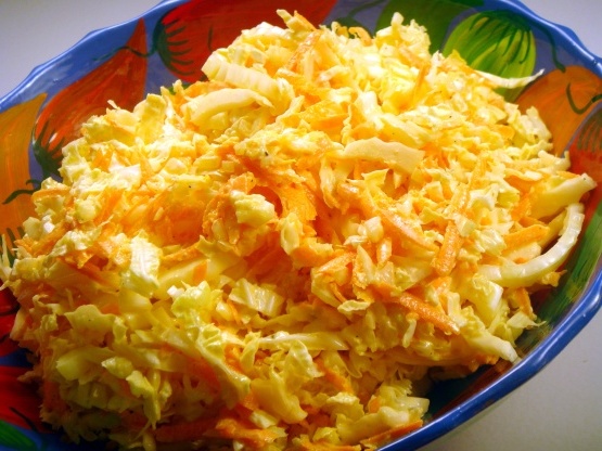 J'ai l'habitude de réparer ce chou quand nous avons du poisson frais.Ma maman a toujours réparé cette salade de chou pour toutes les frites de poisson que nous avons consultées.Mine est tout simplement plus sucrée, c'est ainsi que mon mari l'aime! Le temps de préparation comprend le temps de refroidissement.