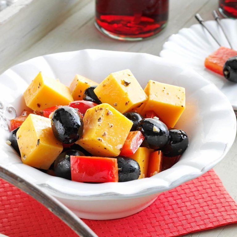 Le fromage cheddar, les poivrons rouges et les olives mûres dénoyautées font un délicieux apéritif rustique lorsqu'ils sont marinés toute la nuit et servis avec des cure-dents décoratifs. —Polly Brunning, Thaxton, Virginie