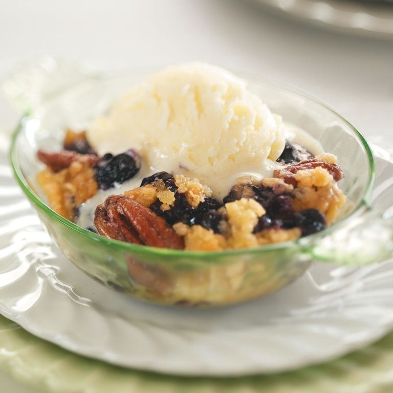 Les noix de pécan grillées ajoutent une touche agréable à ce plat infaillible aux myrtilles. La recette exige un garniture pour tartes et un mélange à gâteaux, vous permettant ainsi de gagner du temps supplémentaire en cuisine.