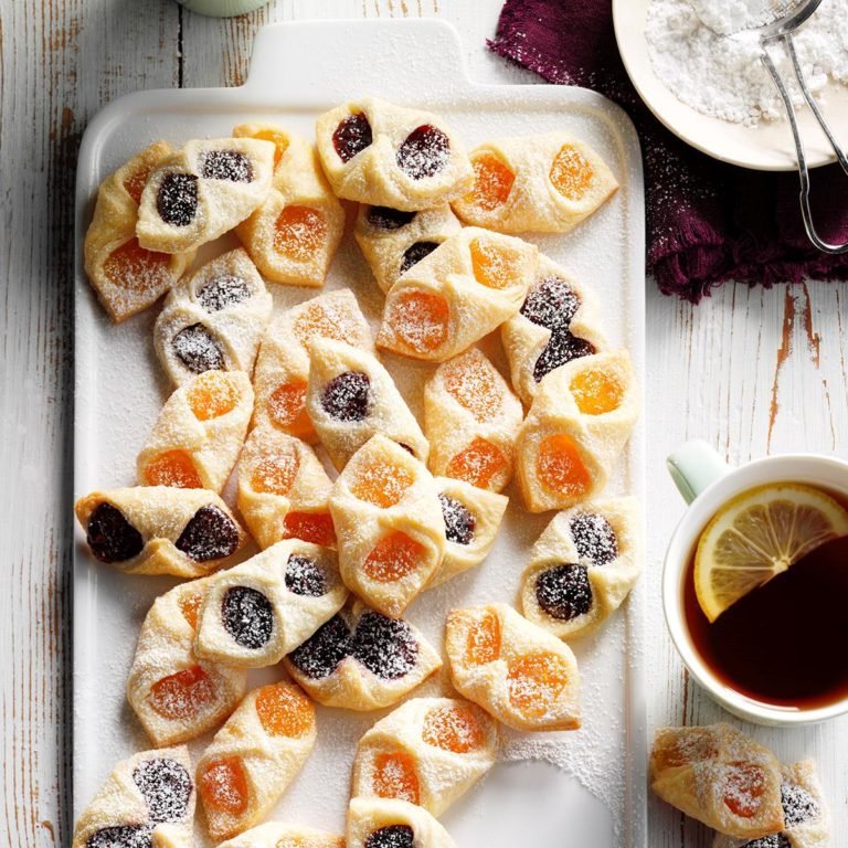 Préchauffer le four à 350 ° .Sur une surface légèrement enfarinée, rouler une portion de pâte dans un rectangle de 12 x 10 po; couper en 2in.quars.Placez une cuillerée à thé de garniture au centre de chaque carré.Ensemblez les deux coins opposés de la pâte sur le remplissage; centimètre serré pour sceller.Placez 2 po.appuyez sur des plaques à pâtisserie non graissées.Répétez avec le reste de la pâte et la garniture.