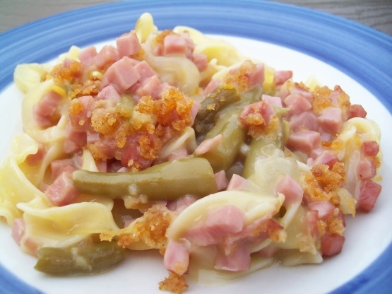 Incorporer la soupe, l'eau, les haricots verts et les nouilles; déposer le mélange dans un plat à gratin préparé.