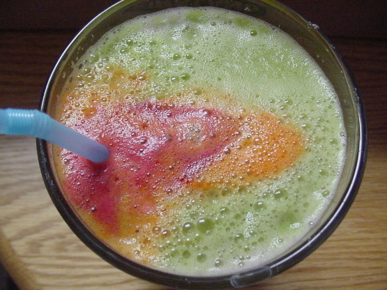 Whizz tout dans une machine à smoothie jusqu'à ce que mélangé. Si vous voulez un smoothie plus juste ajouter un peu plus de jus.