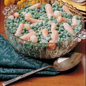 Faire fondre le beurre dans une grande casserole; incorporer la farine jusqu'à consistance lisse.Ajouter progressivement la crème, le bouillon et les assaisonnements.Amener à ébullition en remuant constamment jusqu'à épaississement et faire bouillonner.Ajouter les oignons, les pois et les carottes.Couvrir et laisser mijoter pendant 30 minutes en remuant de temps en temps..