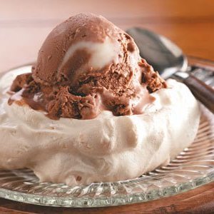 Déposez huit mottes sur une plaque à pâtisserie tapissée de papier parchemin.Faites-les former 3 cuvettes avec le dos d'une cuillère.Cuire au four à 250 ° C pendant 1 heure ou jusqu'à ce que le mélange soit séché.Éteindre le four; laisser les meringues au four pendant 1 heure.Pour servir, garnir les meringues de crème glacée.