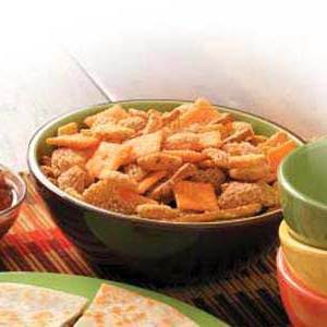 Dans un sac en plastique refermable de 2 gallons, combinez les céréales, les craquelins et les bretzels. Dans un petit bol, combinez l'huile, l'assaisonnement à l'italienne, les graines de fenouil et la sauce au piment fort.