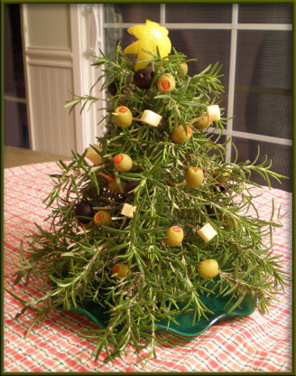 Poussez chaque étoile à fromage dans une moitié de cure-dent, recouvrez l’arbre d’une étoile à fromage et insérez des branches de romarin au hasard.