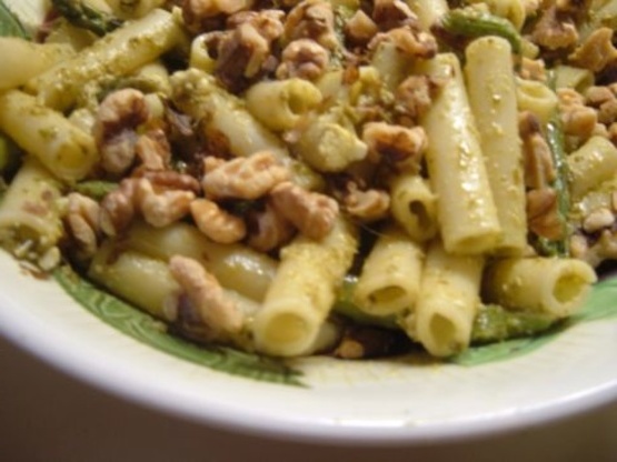 Pendant les 3 dernières minutes du temps de cuisson des penne, ajoutez les asperges dans la casserole et laissez cuire jusqu'à ce qu'elles soient vert vif et tendres-tendres.Égouttez les penne et les asperges dans une passoire.Ajoutez à la casserole avec le pesto et remuez pour bien les enrober.Toptez avec du pain grillé noix et servir à la fois.