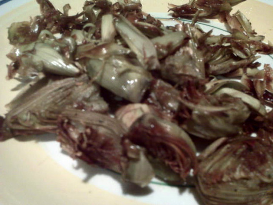 Les artichauts sont consommés presque autant que les oignons en Italie, pas tellement ici aux États-Unis, explique David Tanis, écrivant pour le New York Times. Dans cette recette, ils sont préparés simplement et peuvent être consommés comme collation avec du vin, comme accompagnement de poisson rôti, mélangé avec des spaghettis ou faisant partie d’un plateau d’antipastas. Il est difficile de les éplucher, mais les résultats en valent la peine.