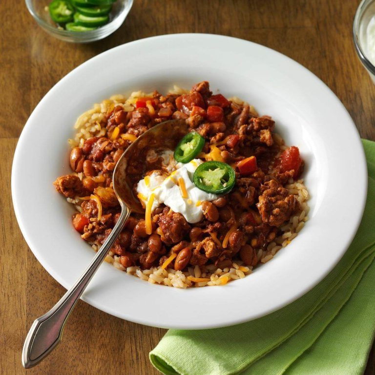 Servir avec du riz et, si vous le souhaitez, des garnitures de votre choix. Option de congélation: congeler le piment refroidi dans un congélateur.Utiliser, décongeler partiellement au réfrigérateur pendant la nuit. Si nécessaire, servir avec du riz brun et des garnitures comme indiqué.