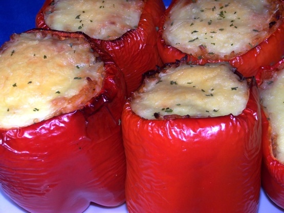 Faites et partagez cette recette de poivrons et poivrons farcis au four.