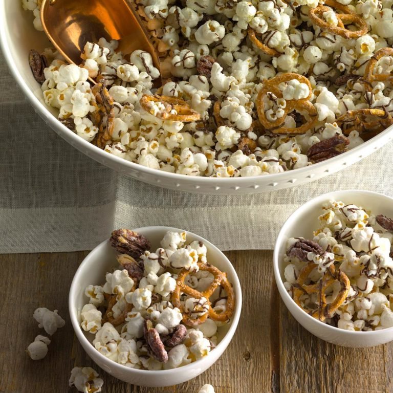 Dans un grand bol, mélanger le maïs soufflé, les bretzels et les pacanes. Arroser de beurre et mélanger; mettre de côté.