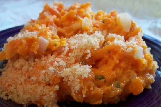 Dans un petit bol, mélanger 1 cuillère à soupe de beurre fondu avec la chapelure; saupoudrer le mélange de carottes en purée.