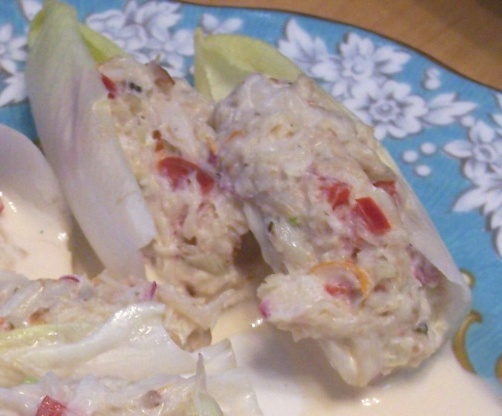 Ces bouchées légères et fraîches ne nécessitent pas de fourchette et sont faciles à emporter lors d’un cocktail ou d’un dîner. Elles peuvent être préparées un jour ou deux à l’avance. Vous pouvez également réduire la taille de la recette pour un déjeuner copieux! L'endive est un membre savoureux de la famille des laitues qui sert de bol naturel et comestible pour la salade de crabe.Regardez les petites têtes d'endives sans feuilles fanées et de couleur vive.La recette originale demandait une crème épaisse, mais elle a été remplacée avec du lait évaporé avec les mêmes résultats et avec moins de calories et de matières grasses.Le tofu au lait fonctionne aussi bien pour les protéines ajoutées.