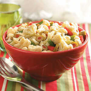 Dans un bol à salade, combiner le chou-fleur, les olives et les poivrons; arroser de vinaigrette et mélanger pour bien enrober.