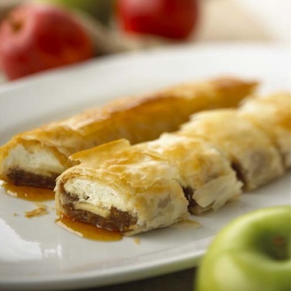 Repliez les extrémités sur les pommes et le fromage.Roulez le phyllo et remplissez-le sur lui-même pour former un rouleau de strudel.
