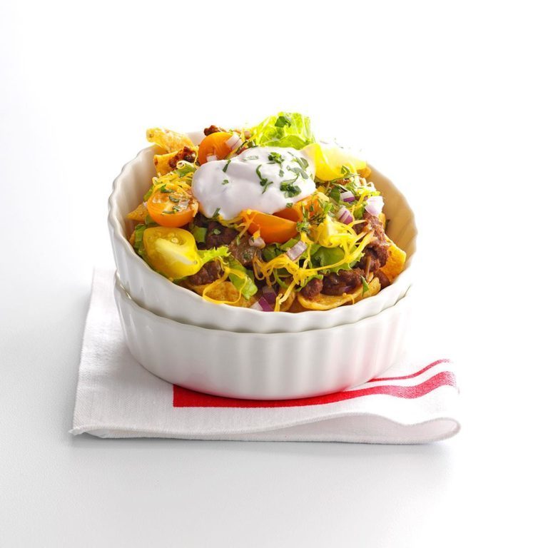 Pour servir, répartir les frites dans six coupes. Garnir du mélange de bœuf, de laitue, de fromage, de tomates et d'oignons.Si vous le souhaitez, garnir de crème sure et de coriandre.