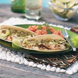 Tacos au flétan grillé à la baja avec salsa verde rôtie au feu