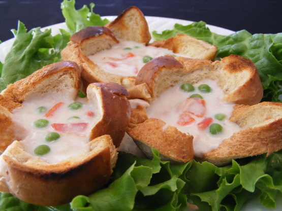 Pendant que le pain est chaud, versez le mélange de thon à la crème dans des tasses à pain et servez.
